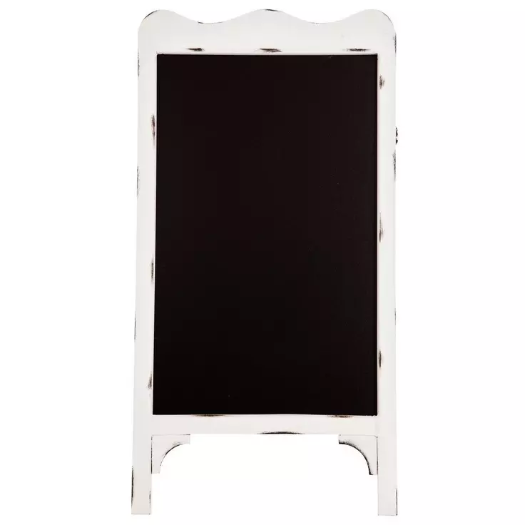 Add a charming, rustic touch to your event with our white framed Chalkboard Easel. This standing white‑wood sandwich‑board features a classic black chalkboard surface on both sides, framed in distressed white wood with subtle scalloped detailing. Perfect for welcoming guests, displaying menus, showcasing signature drinks, or adding personality to stations like your Bloom Bar.